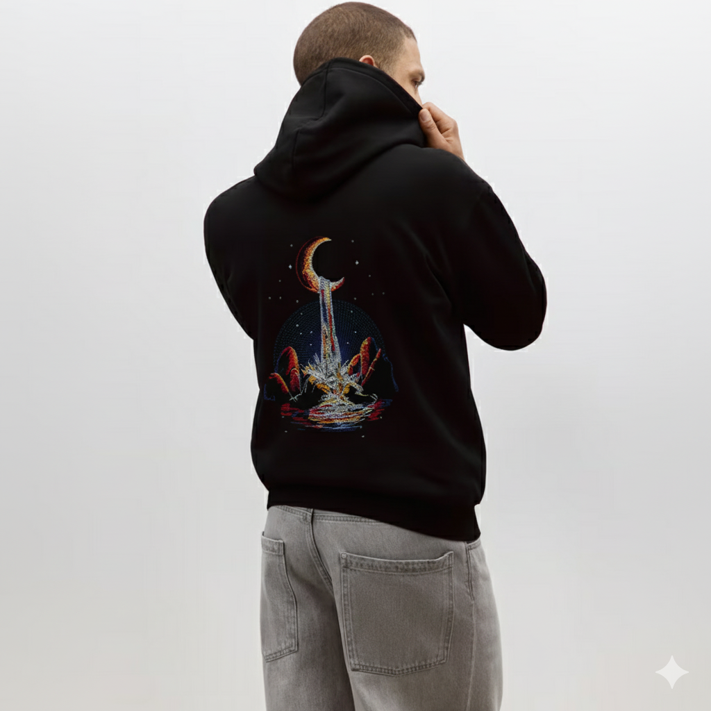 Cosmic Waterfall feels like that moment when everything slows down and the world gets quiet for a bit. The fabric’s soft and heavy in the right way, with a relaxed fit that just falls right on you. The back print has that late-night calm, like a memory you can’t place but don’t want to lose. It’s easy, effortless, and made for people who don’t need to try too hard to stand out.